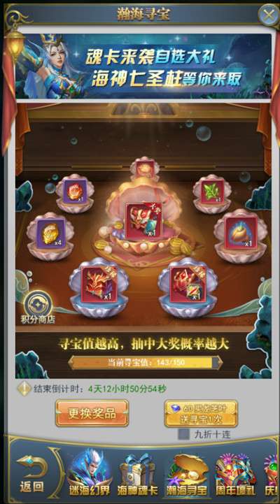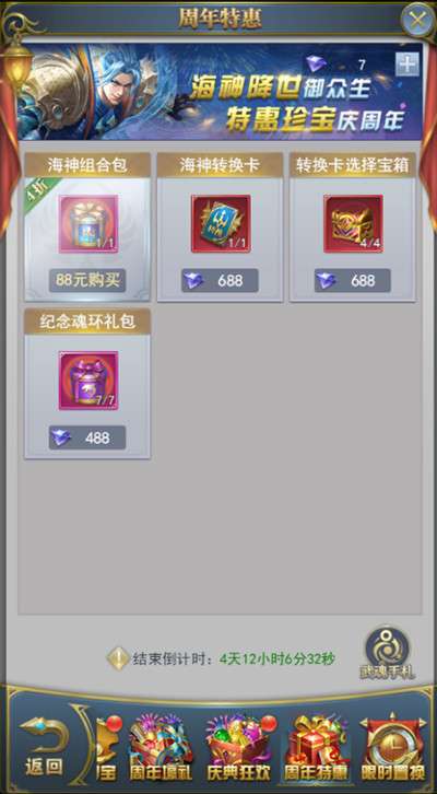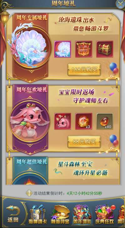 活动期间,将开启迷海幻界、海神魂卡、瀚海寻宝、周年壕礼、庆典狂欢、周年特惠、限时置换、周年福利、周年请柬、魂环兑换等10项内容。