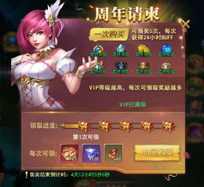周年请柬购买后可领取5次,每次获得精美道具奖励并获得持续24小时的buff加成;