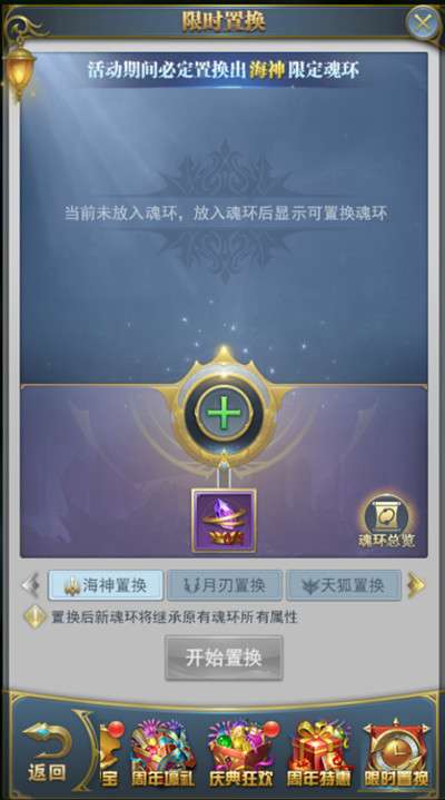 活动期间,开放海神、月刃、天狐、饕餮神牛、箫鼎、双生蛛皇、奇茸通天菊、碧磷蛇皇、泰坦巨猿、四眼猫鹰、鬼魅、昊天锤、六翼天使、九心海棠、七杀剑、骨龙、蓝电霸王龙、玄龟、香肠、灵猫的限定魂环的置换。