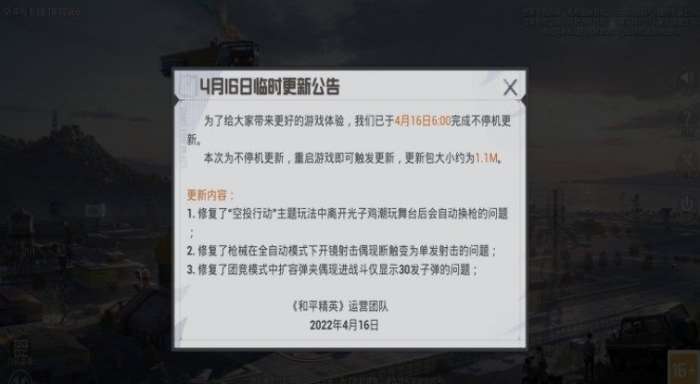 “空投行动”更新之后,连续迎来“小更新”,主题创意模式“空投行动”连续修复,如今又更新1.1M后再次进行修复。