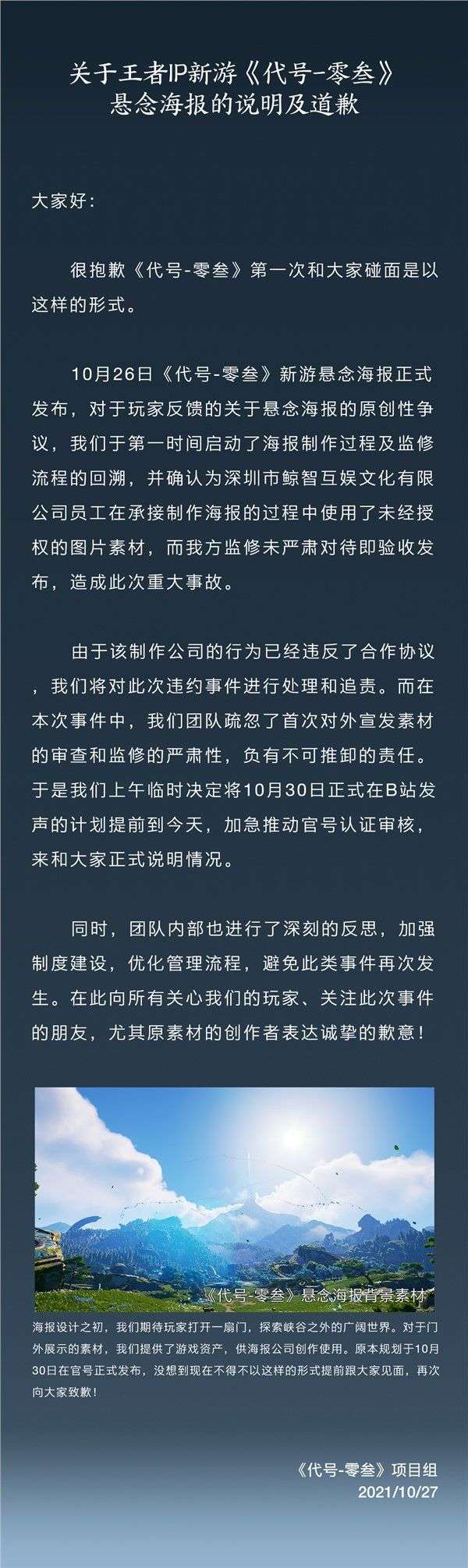 同年10月,《王者荣耀》IP新游《代号:零叁》被曝出宣传海报抄袭《原神》 ,该海报使用的是《原神》星落湖素材,事情发生后,官方在次日发文致歉,并表示本次事件主要是制作海报的外包公司问题,腾讯将对此事件相关人员进行严肃处理。
