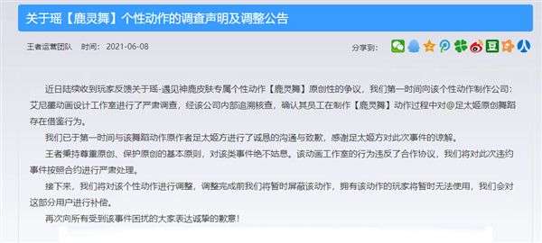 官方公告指出,已第一时间与该舞蹈动作原作者足太姬方进行了诚恳的沟通与致歉。