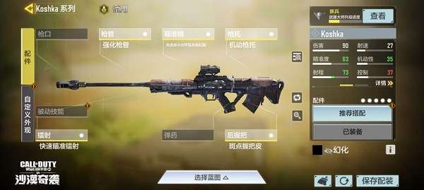 《使命召唤手游》Koshka是游戏中的一个特化狙击,玩家在这个狙击枪上可以进行不同的配件选择来使狙击有不同的风格,其中风格最明显的配件选择也是有两套的,可能还有玩家不清楚,下面小编就给大家整理了具体的配件攻略,一起来看看吧!