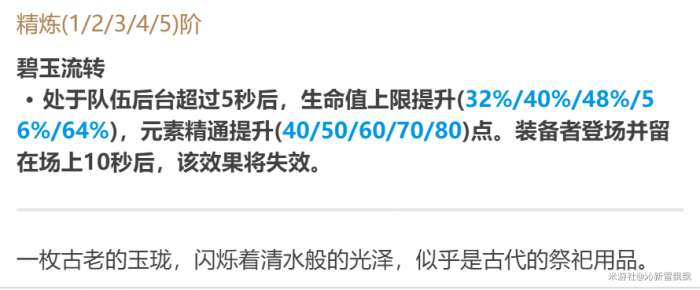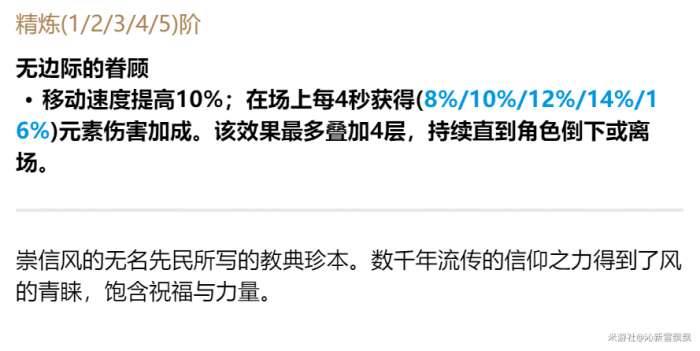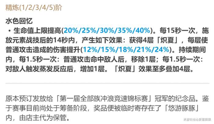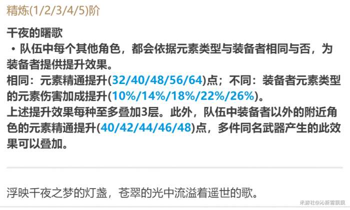 武器本身基础属性提供了大量的元素精通,此外,根据队伍中其他角色与装备者元素类型相同与否提供元素精通和元素伤害两方面的提升,对于走蒸发流的玛拉妮伤害非常可观