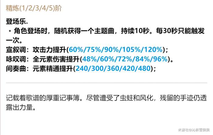 作为开服的老牌四星武器,基础数值给予了暴伤提高,武器效果在登场时于宣叙咏叹间奏曲调中,随机触发一种持续10秒,而其中对于玛拉妮触发有用的效果概率为2/3,给予的提升数值大,精一为例就能提供48%元素伤害/240精通提升,满精则飙升为恐怖的96%/480