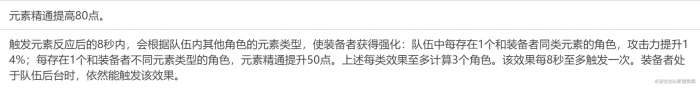 两件套提供元素精通,四件套触发元素反应后,根据队伍内其他角色类型提供攻击力和元素精通的提升,且对于玛拉妮处于后台,前台触发元素反应时依然能够生效