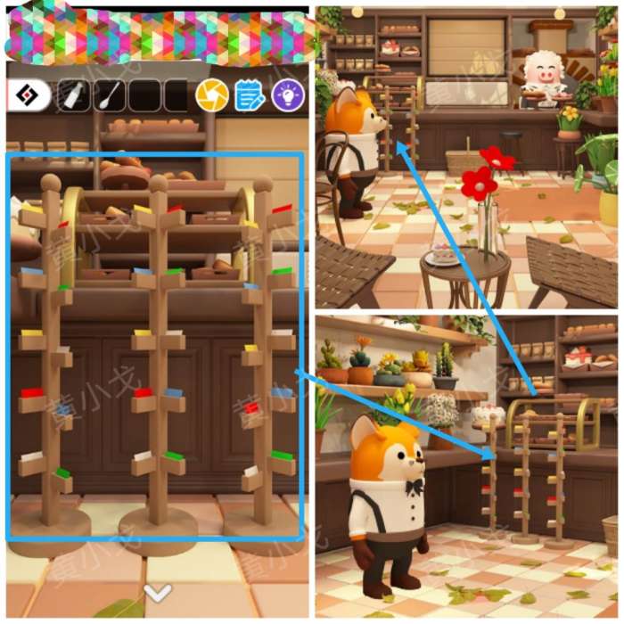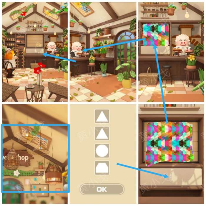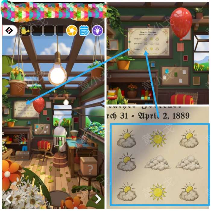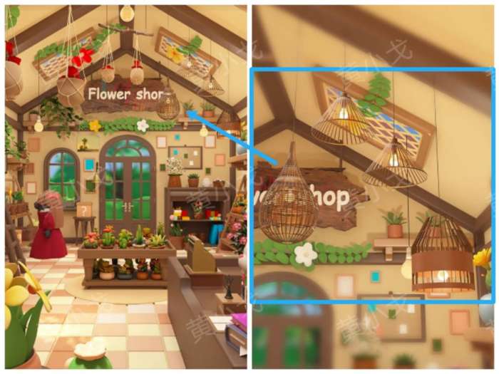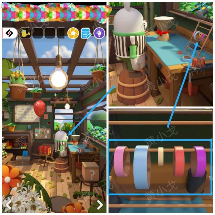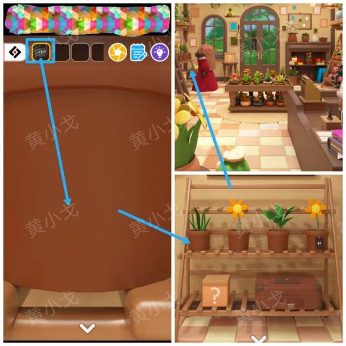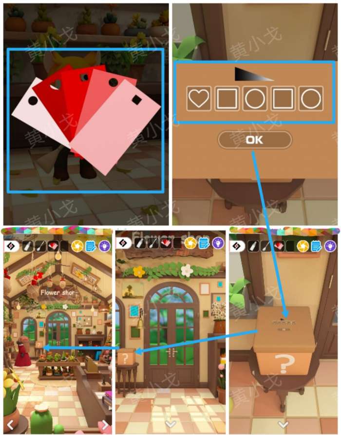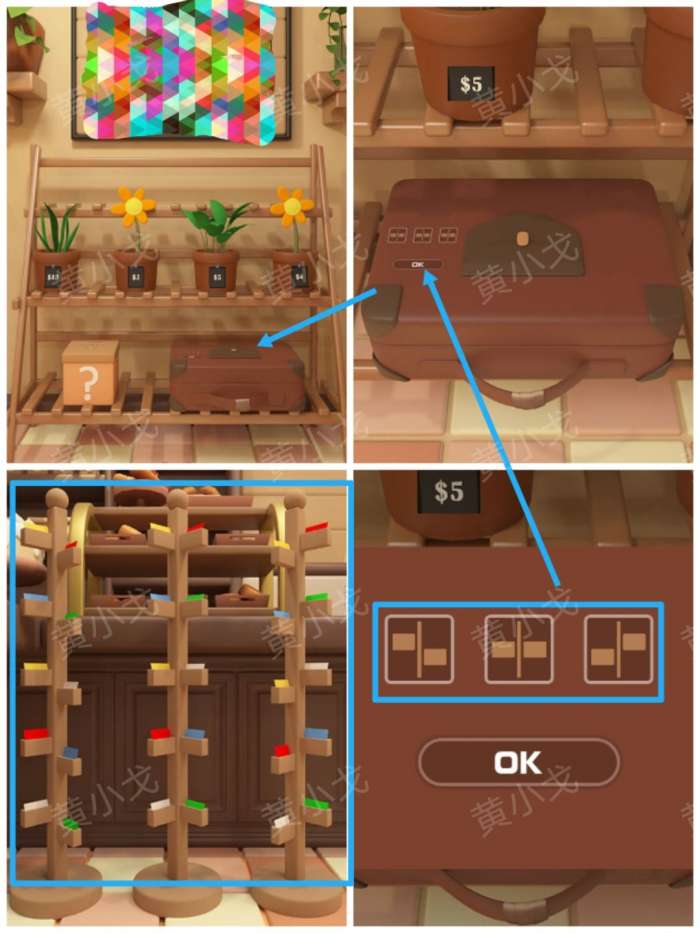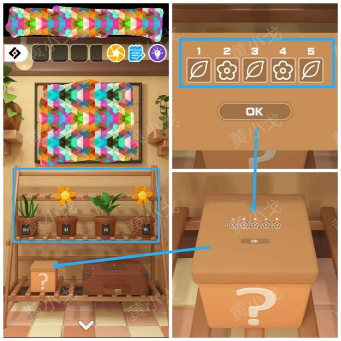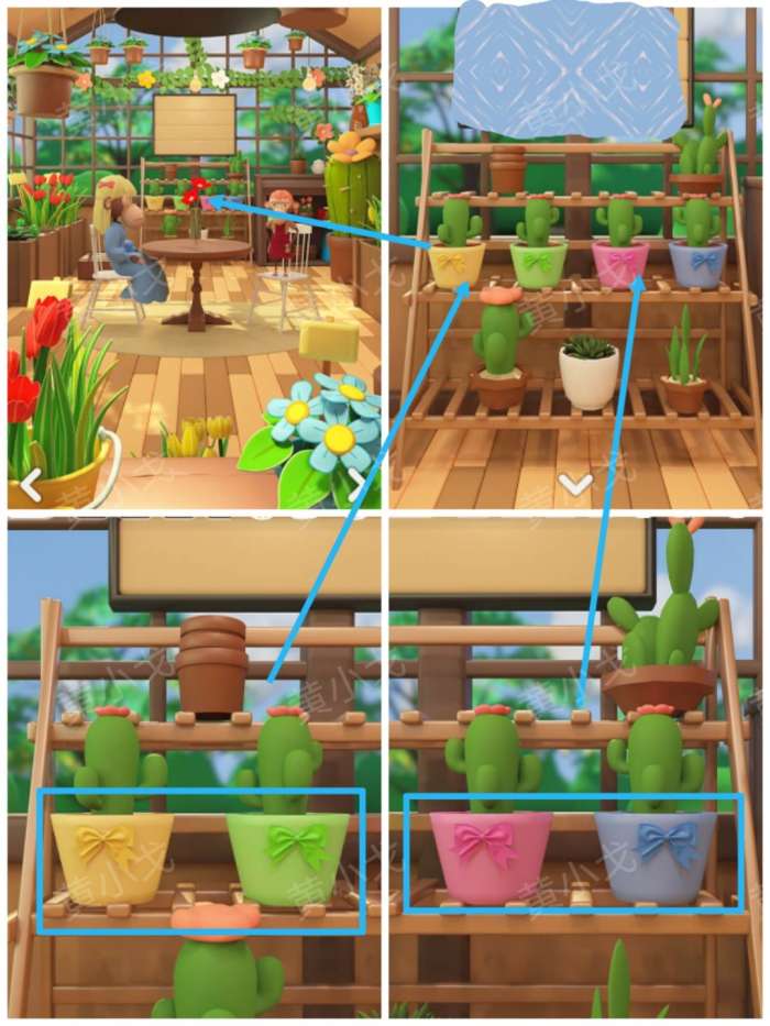 Escape Room:密室逃脱:花香工坊图文攻略(一),可查看中间的架子上的仙人掌,获得线索,花盆的颜色及上面的蝴蝶结:黄绿粉蓝,在大门处点击右侧柜台,点击柜子上的盒子,根据上面的蝴蝶结图案提示,结合[餐桌]场景仙人掌花盆的颜色,调整密码锁。