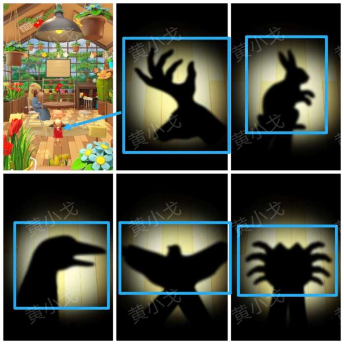 手影形状:鹿、兔子、鸭子、鸟、蜘蛛