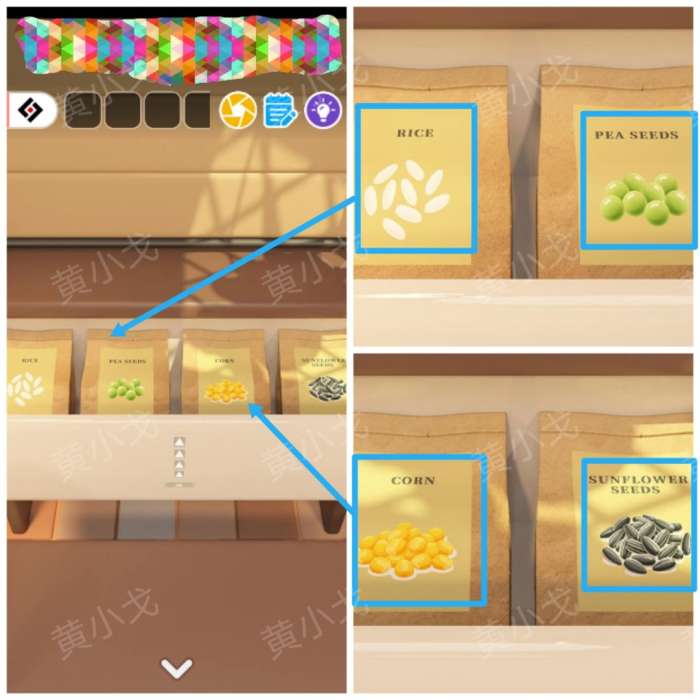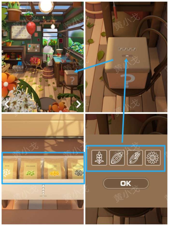 16.点击凳子上的盒子上的密码锁,根据[]场景种子包装袋上的图案和英文,调整密码锁