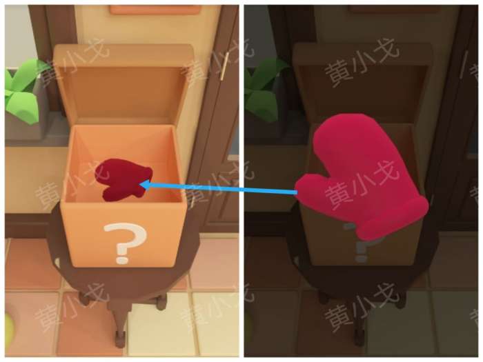 2.点击右侧柜台,点击柜子上的盒子,根据上面的蝴蝶结图案提示,结合[餐桌]场景仙人掌花盆的颜色,调整密码锁