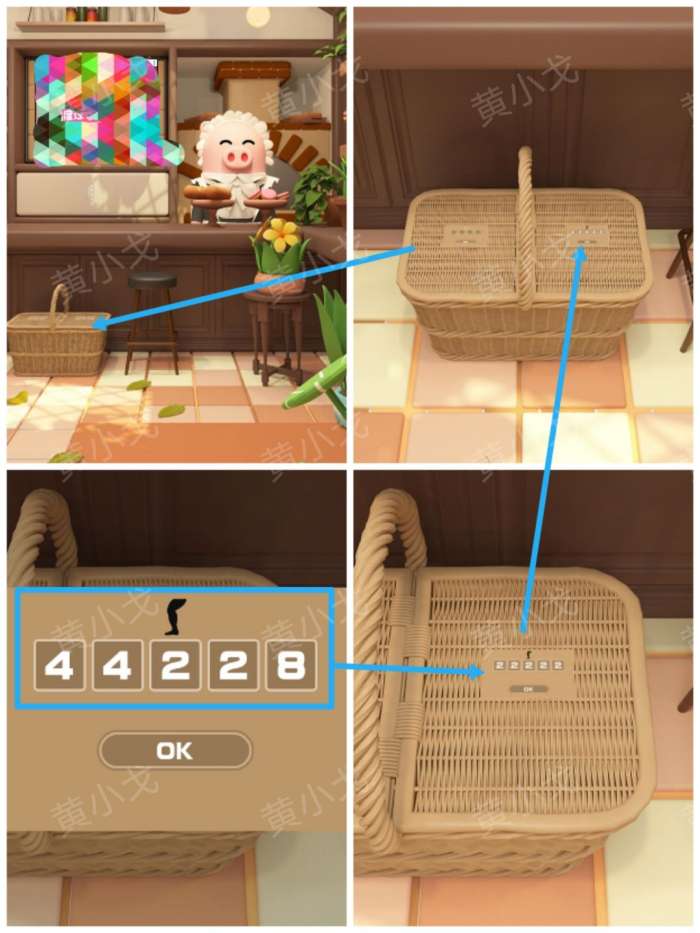 13.点击柜台前面的篮子右侧盖子上的密码锁,根据上面的图案提示,结合[餐桌]场景手影形状线索,输入密码:44228