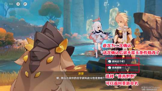 起好名字后会出现派蒙的对话,这里就是最后一次确认了,各位旅行者确认好自己起的名字后,选择“就叫这个吧”即可完成确认,后续就不能再无条件修改了;如果还想修改的话,选择“我再想想”就可以返回上一级重新命名。