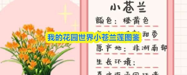 我的花园世界小苍兰莲图鉴:小苍兰呈橙黄色,散发清新甜香,原产非洲南部。它喜凉爽通风环境,花语寓意纯洁、幸福与浓情。其愉悦香气也成为了多款经典香水的灵感来源。