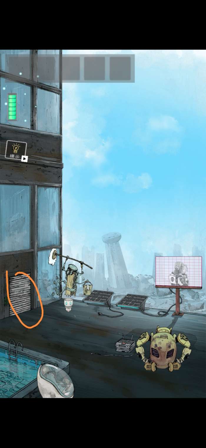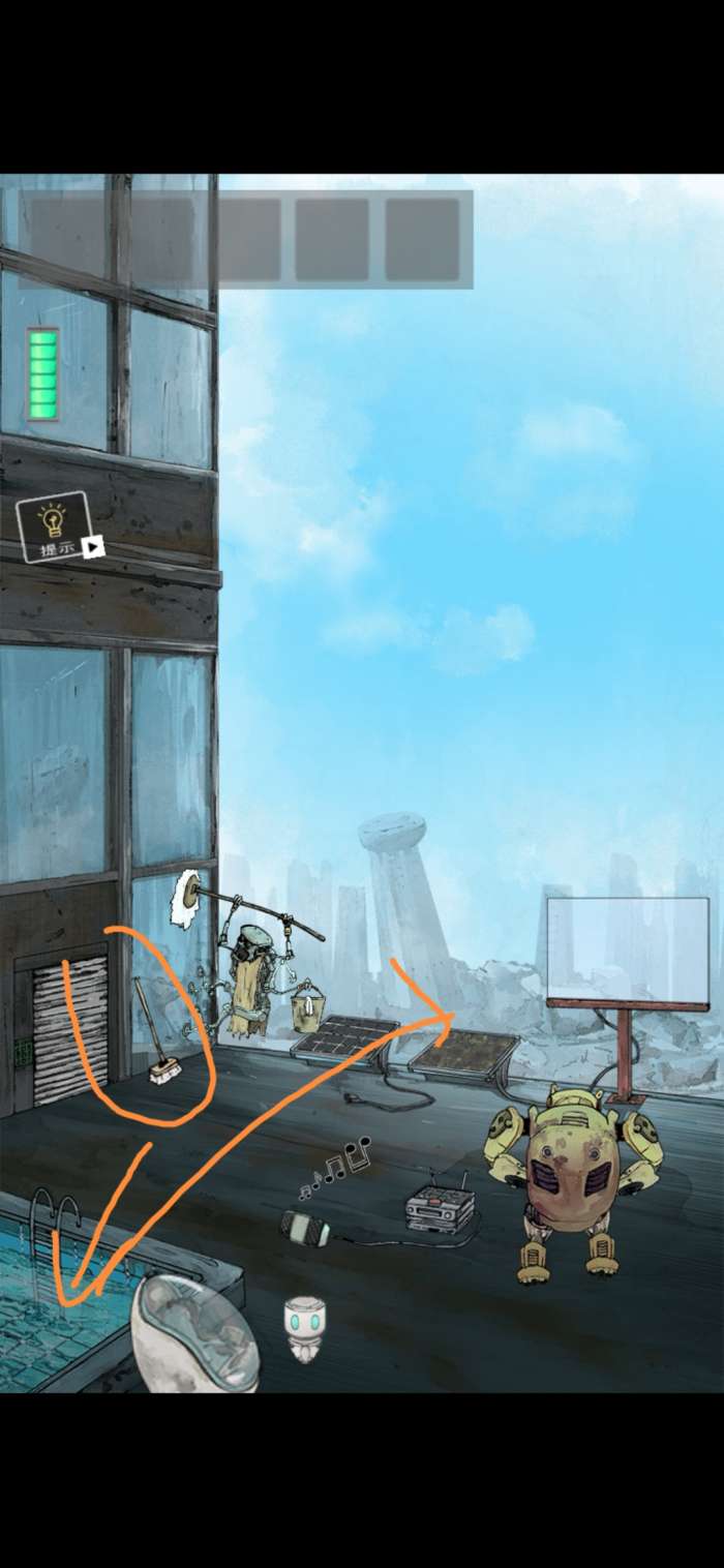 点击拖把,用拖把沾水清洗太阳能板,点击得到喇叭,把喇叭安装在清洁机器人嘴上,根据口哨提示得到门的密码831313,点击大门输入来到场景四