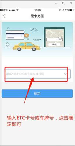 8、在无卡充值点击进入之后,输入ETC卡号或者车牌号码,点击确定即可进入充值页面进行充值,完成充值即可。