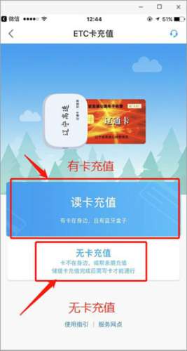 7、在充值页面有两种选择,a身边有卡,有蓝牙盒子,即可读卡充值,b身边无卡,或者没有蓝牙盒子,选择此项;