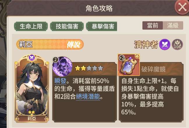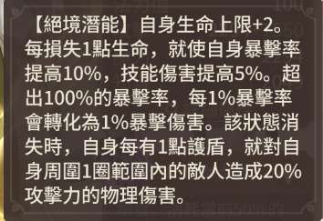 3(现在版本):前半段与2相同,但是另外根据血上限另外加暴击和爆伤,而且还能额外造成伤害。看技能描述数值加成好像是没有上限的,不过限制了buff的回合数。(详见下图)