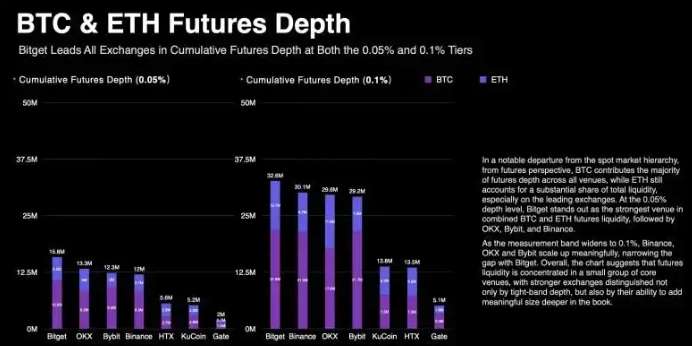 合约市场则呈现差异化格局。Bitget 在 BTC 与 ETH 合约订单簿深度方面表现突出,在 0.05% 与 0.1%区间均保持领先。从大额卖单滑点表现来看,BTC 合约流动性在头部平台之间整体较为均衡,而 ETH 合约则呈现更明显的平台分化,Bitget 与 OKX 在500 万美元卖单场景下滑点最低。BTC 和 ETH 合约的买卖价差在主流交易所间整体维持低位,反映出衍生品市场结构日趋成熟。