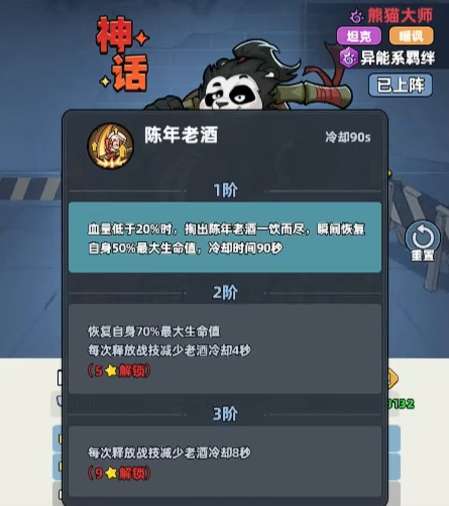 相对于队友需要输出空间来说,他这个技能是非常好用的,另外在他自身的被动能力上面,也就是陈年老酒这个技能当中,大家可以看到他血量只要是低于20%的情况下,也就是说即将下场的时候他就可以用到这个能力,瞬间可以为他自身带来50%的生命恢复,冷却时间上面确实是非常久,达到了一分半钟的时间,所以基本上一个回合里面不一定能触发第二次,而其中如果大家想要采取翻盘的话,这个能力是一定会用到的,另外在二星解锁的皮糙肉厚这个能力当中,如果受到敌人的普攻,会有20%的概率触发自身的反击,反击的时候对敌人造成的伤害当中,是提取到生命数值当中的1.5%,所以反击的数值不高,但是他会为自身带来同样百分比的血量恢复,每隔5秒的话,就可以触发一次的话,提升足够多的反击数值也是可以的。