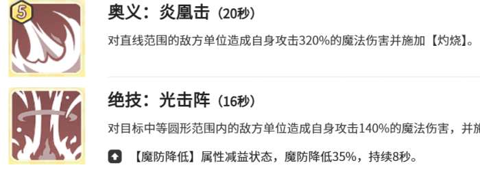 梅琳娜的技能主要是围绕火焰输出,还有状态增益。天赋是核心的竞争力,一级就可以让首次的炎凰击获得50%的奥义增伤,配合7级解锁的N次状态附加模仿降低效果,一下子就可以撕开敌方的防御。四级天赋让元素反应后可以获得试剂和二级天赋的士气还有斗志结合在一起就能触发恩赐状态,然后形成闭环。持续强化输出的能力,进一步提升攻击效果,给团队创造出很好的输出环境。