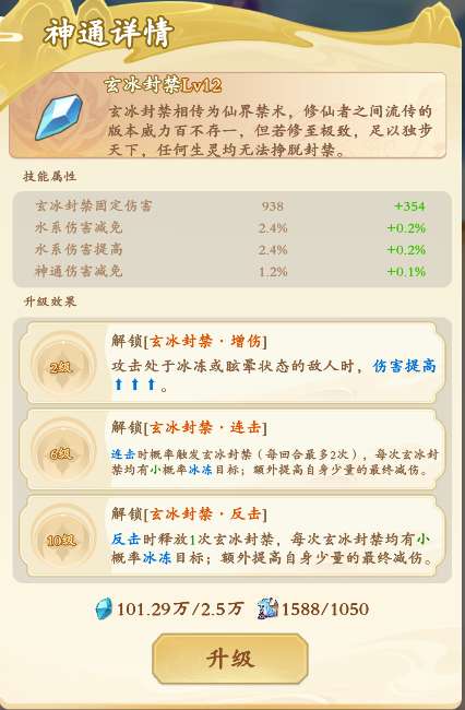4. 玄冰封禁(水属性神通):多条件触发;技能定位偏向控制辅助,冰冻减伤。