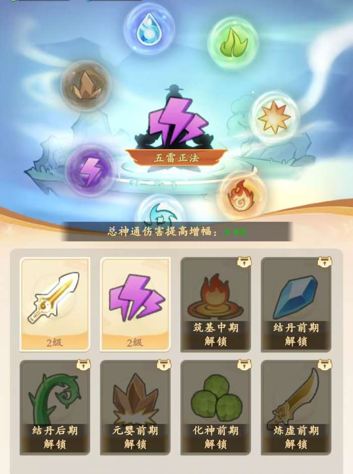 神通技能局外养成,通过消耗灵石和神通真义来提高神通等级,解锁更强力的技能效果。
