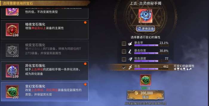 这个宝石更牛逼,可用来打造完美装备!要4级以上石板才能掉落(有石板还得打得过,打过后还要看运气掉落)。变幻宝石可以直接变幻装备词条,保留其长度。所以大佬们可以适当的保留满词条装备,但是每次变幻的属性不一样,可能要多次变幻才能随机出想要的词条。
