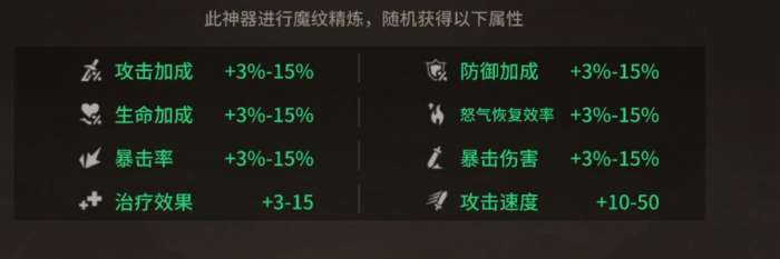魔纹精炼可增加一条额外的属性,魔纹宝石要3级以上石板才能掉落,比较珍贵。建议先将需要精炼的神器都精炼,后续再多次使用选择适用的属性。