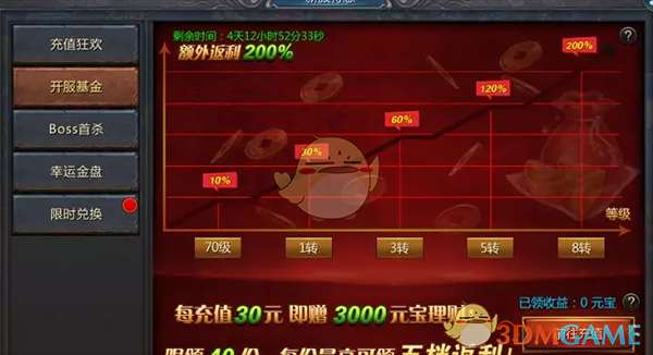 新区活动很多。最福利的当属基金和轮盘。基金大家每充值30元即可获得赠送一份基金。40份封顶。升级到对应等级获得对应元宝奖励8转累计可得200%奖励 40份共计24万元宝。