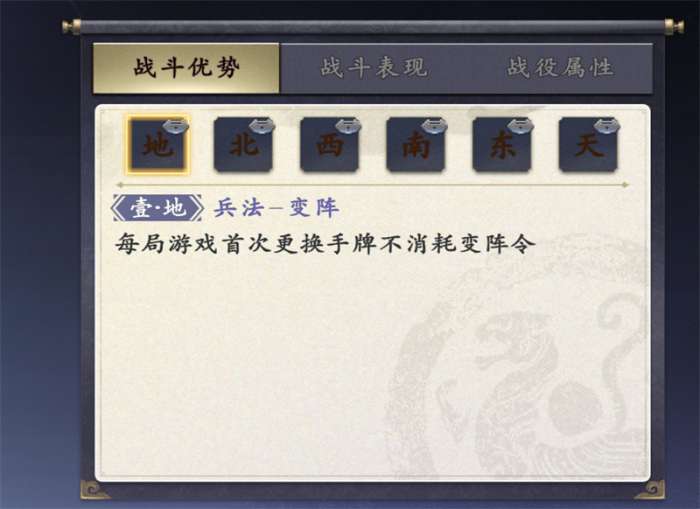 2阶(对应地):每局游戏首次更换手牌不消耗变阵令,可优化牌序,要选这名武将才可生效;