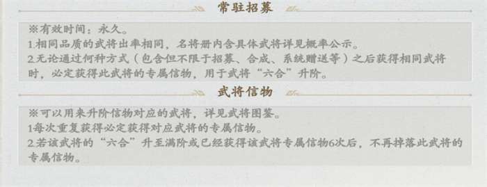 无论通过任何方式获得相同武将后,必定可获得此武将专属信物,信物可用于武将“六合”升阶。