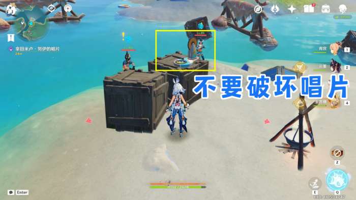 唱片就在营地中央木箱上,注意!不要击碎木箱因此建议: