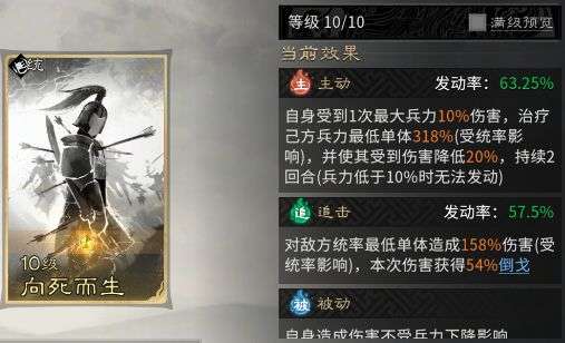 主动技能固定携带【向死而生】,该技能在对自身造成一次伤害的同时,会治疗我方当前兵力最低的单位,并施加一个“受到伤害降低”的强力增益。