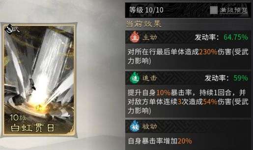 主动技能固定携带【白虹贯日】,该技能可精准锁定自身所在行的后排单体目标,对其造成一次超高额的单体伤害。