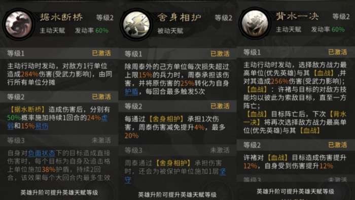 周泰的天赋【舍生相护】可为许褚分摊伤害,构成“许褚锁头,周泰承伤”的经典配合,能有效针对敌方核心。