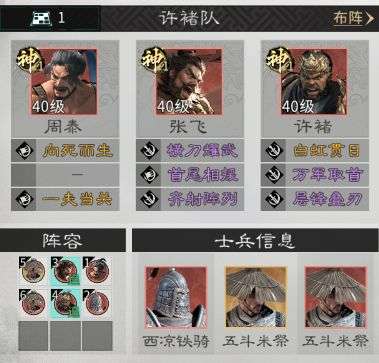 兵种站位:在周泰的下方放置一个西凉铁骑,在张飞与许褚身后各放置一名五斗米祭。