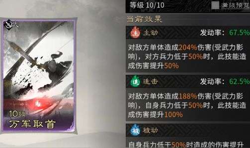 追击技能固定携带【万军取首】,该技能本身即为高额单体伤害。其核心机制在于血量阈值触发:当使用者自身兵力低于50%时,此技能的伤害提升100%。