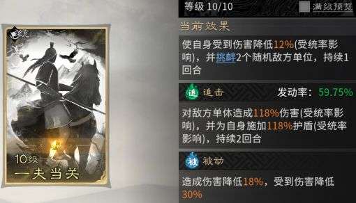 被动技能固定携带【一夫当关】,自该效果使自身造成的伤害降低,同时显著减少所受到的伤害。这两重减伤叠加,能大幅度降低自身承受的伤害总量。若再配合主动技能 【向死而生】 提供的额外减伤,其生存能力将达到极高阈值。