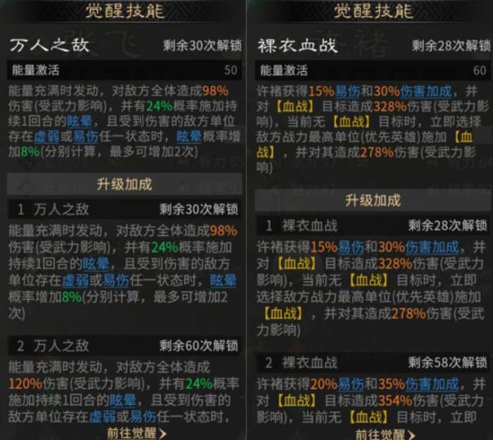 许褚的天赋【背水一决】与觉醒技【裸衣血战】均能锁定敌方战力最高单位,形成至死方休的决斗,是队伍的“刺客”。