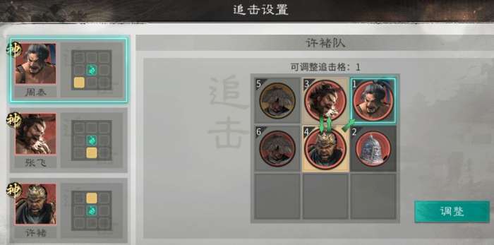 英雄站位:周泰不站追击格,许褚站周泰追击格,并与张飞互站追击格。