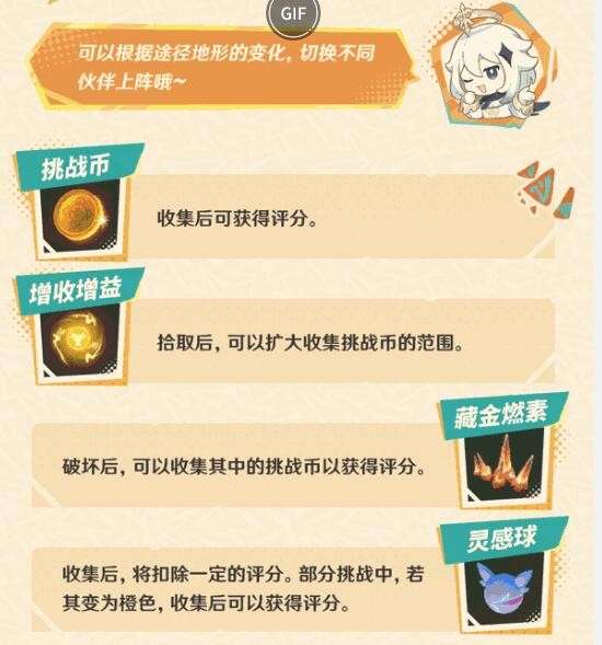 ● 「奔流真形」中,旅行者可借助各种龙的技能与特性,在限定时间内到达终点,途中尽可能收集更多的挑战币和灵感球,来提升挑战的评价,获取奖励。