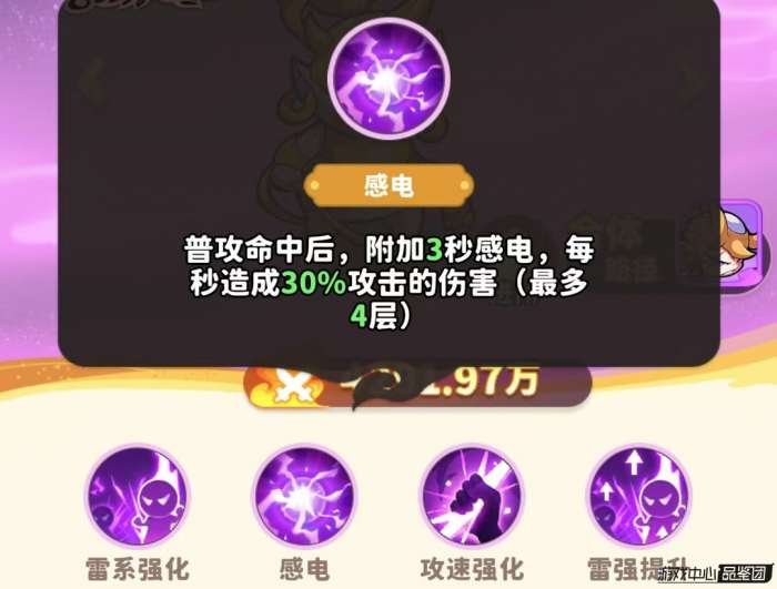 这4个技能都非常实用,其中雷系强化和雷强提升都是提升相邻雷系英雄攻击力的被动,一个提升12%,一个提升18%,这两者可以叠加,上限都是4层。在最大化接邻主力输出的情况下,最多能给主力雷系输出提升120%的攻击,在前期来说可谓质变!