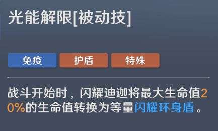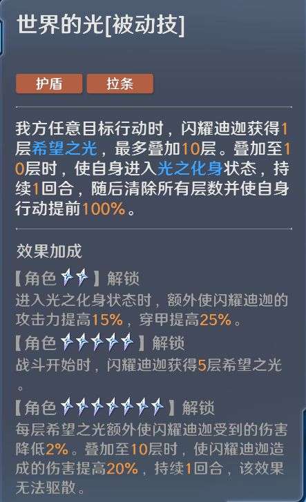 闪耀迪迦拥有护盾叠伤和拉条,同时免疫负面,额外获得护盾与闪卡【世界的希望之光】。在当前版本属于较为强势的输出型角色