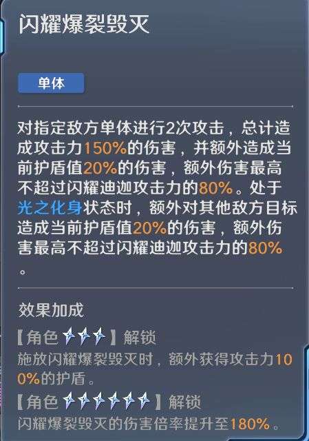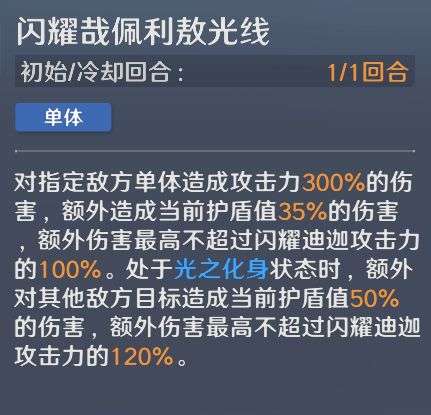 进入<光之化身>状态对敌方全体造成伤害对目标额外造成当前护盾值伤害