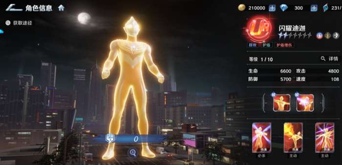 闪耀迪迦是获得全世界的孩子和丽娜(沉睡的超古代战士)的光芒强化后的究极形态,可从开服冲榜和珍藏馆内获得。