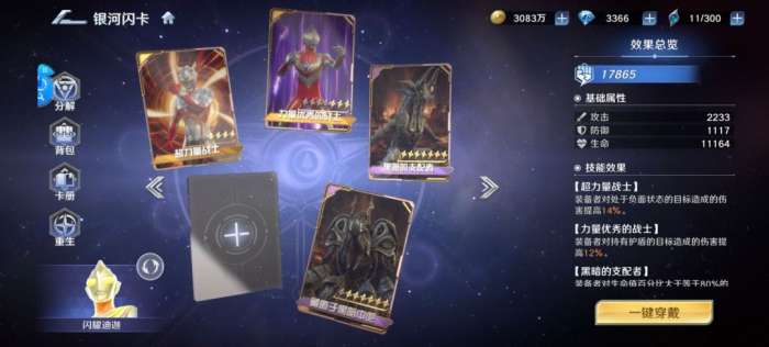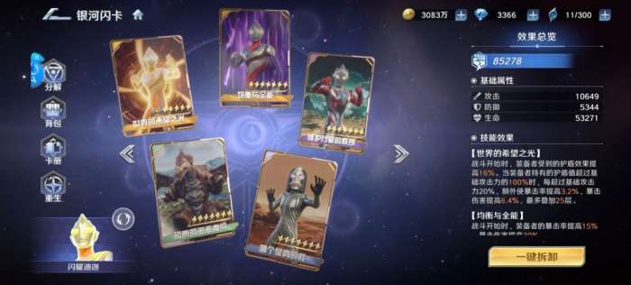 闪卡:可使用【奇兽-蓝】获得护盾、【斗志燃烧的战士-紫】必杀获得穿甲、【生命的不断延续-紫】提高暴击伤害、【维护行星的秩序-紫】提高暴击率、【黑暗的支配者-紫】攻击高生命目标伤害提高、【怨念与黑暗的化身-紫】防御降低,攻击提高、【世界的希望之光-金】提高护盾、暴击率和暴击伤害、【超高速战士-金】伤害降低,免伤提高、【力量优秀的战士-金】攻击护盾目标伤害提高、【超力量战士-金】攻击负面目标伤害提高、【均衡与全能-金】提高暴击率和暴击伤害