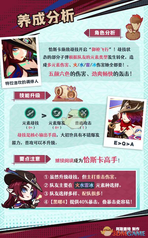 ◆三色队能更好地发挥情况恰斯卡的子弹染色机制、天赋1增伤效果——每轮重击都能打出4枚染色子弹、获得60%重击增伤。该玩法的元素反应相对双色队更加丰富,队友在火水雷冰中凑齐三种就能让恰斯卡畅快输出。