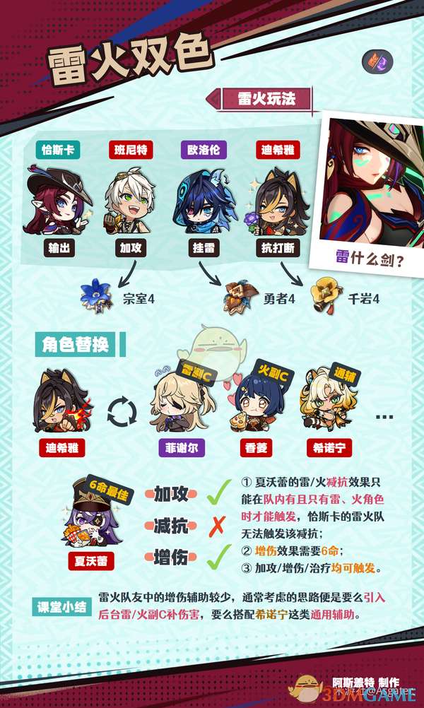 ◆恰斯卡的雷火玩法需要注意的是无法触发夏沃蕾的雷火减抗效果——因为恰斯卡是风元素角色,不符合夏沃蕾的天赋的要求(队内有且仅有雷火)。夏沃蕾未解锁6命时,通常不考虑入队。