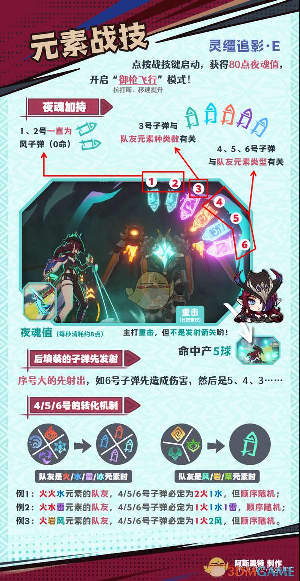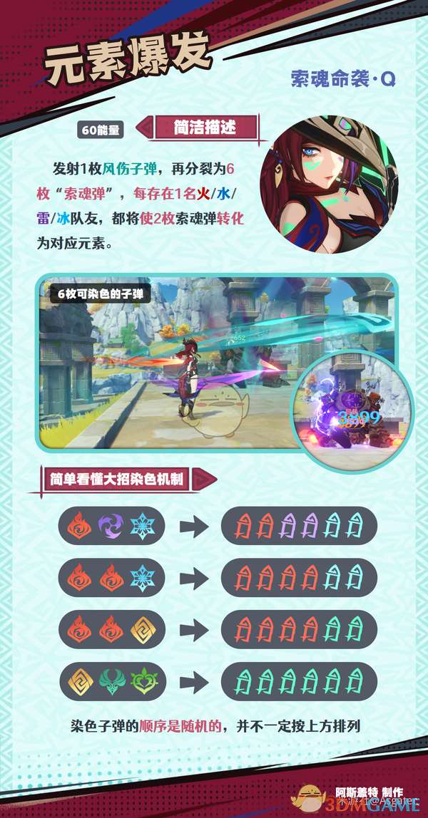 ② 大招的染色机制更简单,纯看队友元素——每有1位火水雷冰元素的角色,就使大招的2枚子弹转化为对应元素的子弹(上图所示)。