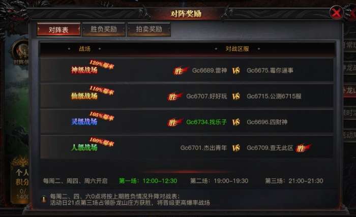 首场匹配前进行本区人气助威,助威值决定参战级别: